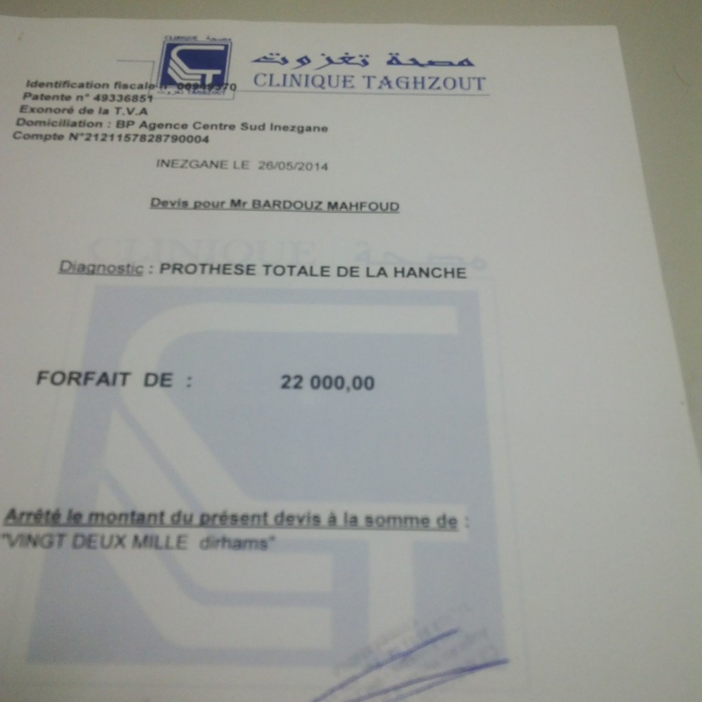 أنا المسمى المحفوظ بردوز من مواليد بلدية الأخصاص سنة 1980، رقم تعريفي الوطني JE192983 أب لطفلتين، بدون عمل، وذلك جراء إصابتي بكسر على مستوى الورك مما استدعى قيامي بعملية جراحية أولى قبل سنتين لم تكلل بالنجاح إذ قام الطبيب الجراح بترك جزء من الحديد على مستوى وركي، ما أدى إلى عدم تساوي رجلي بفارق 10 سنتيمات، مما تطلب عملية جراحية أخرى لم أجرها بعد لعدم توفري على المبلغ المطلوب لهذه العملية ألا وهو 36.000,00 درهم.