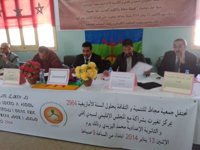 جمعية “مجاط للتنمية والثقافة” استهلت حفلها الافتتاحي التي احتضنته إحدى قاعات الثانوية التأهيلية “محمد اليزيدي” بندوة حول علمية وفكرية حول واقع اللغة والثقافة الأمازيغيتين من تأطير أحد أعضاء فرع الشبكة الأمازيغية من أجل المواطنة بــ”إمجاط”، إضافة إلى ندوة حول موضوع “قبيلة إمجاط والإقليم الجديد، أية حصيلة”؟ بشراكة مع المجلس الإقليمي لـ”سيدي إفني” والثانوية الإعدادية “محمد اليزيدي”.