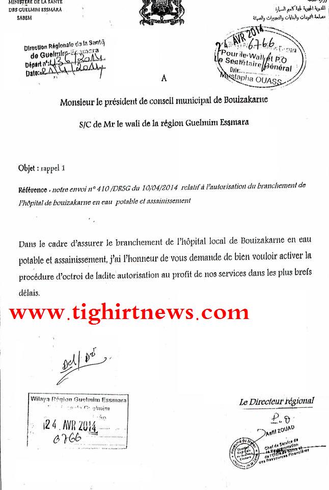 حيث وجهت مندوبية الصحة بـ”كلميم” المراسلة الأولى بتاريخ 10 أبريل 2014 للرئاسة المجلس البلدي تطالبه بترخيص ربط المستشفى المحلي بالكهرباء و الماء الصالح للشرب. إلا أن المجلس تجاهل الرد على المراسلة الأولى لتقوم مندوبية الصحة بكلميم بتذكيره بتوجيهها لمراسلة ثانية بتاريخ 24 أبريل 2014 أملا منها أن يتفضل رئيس المجلس بالرد.